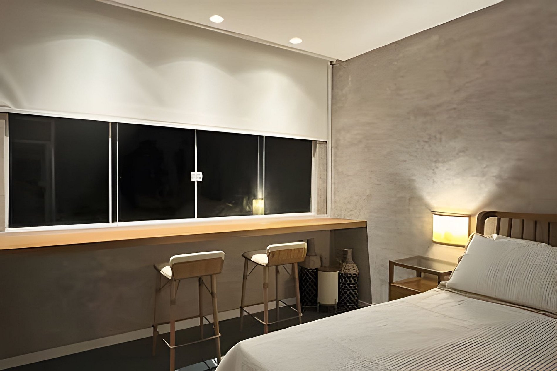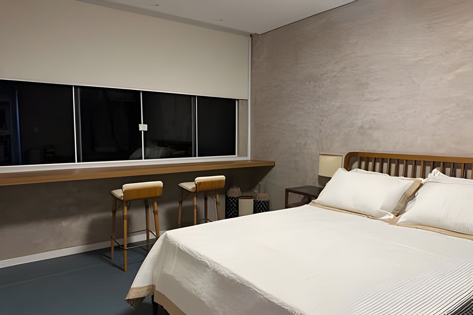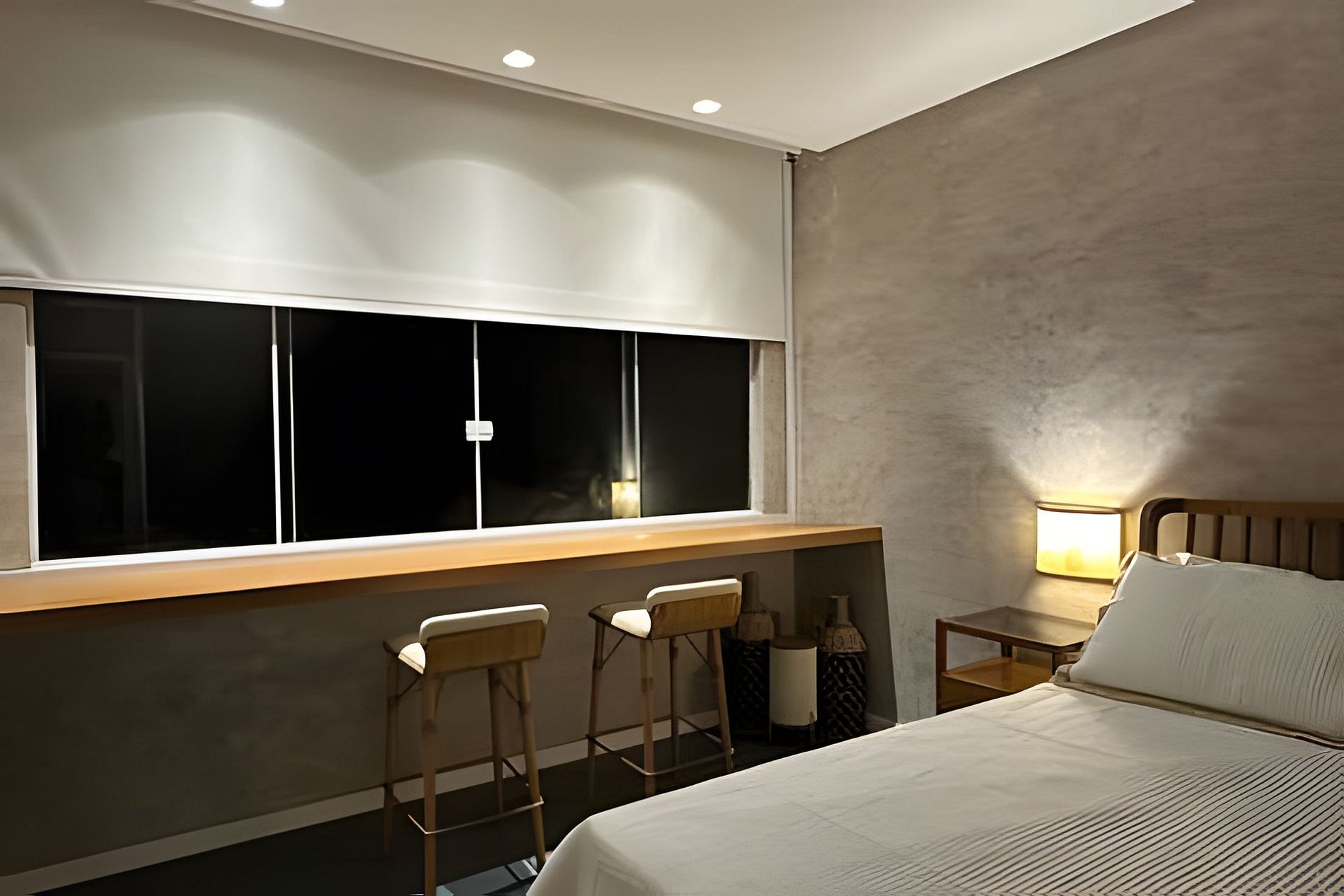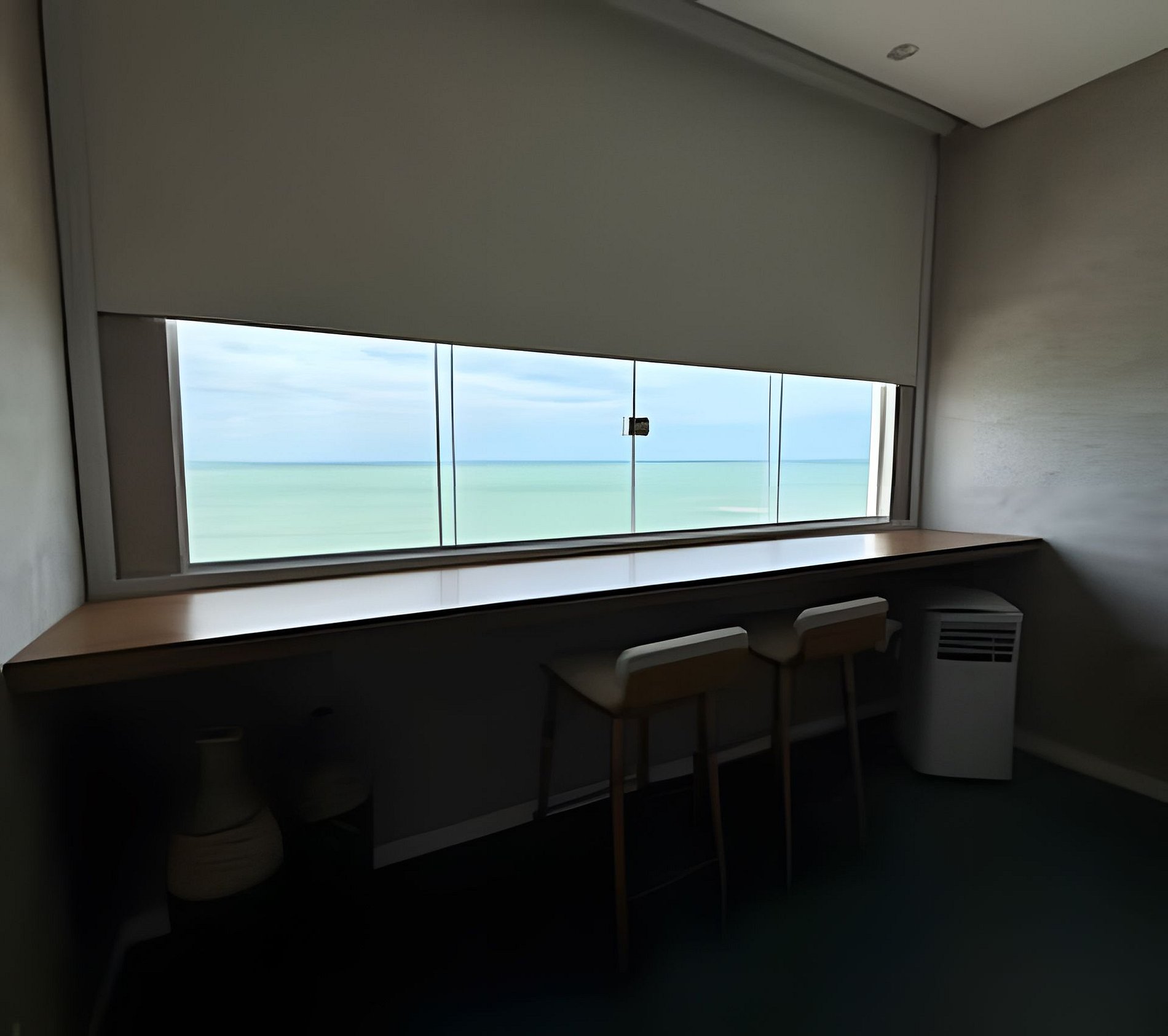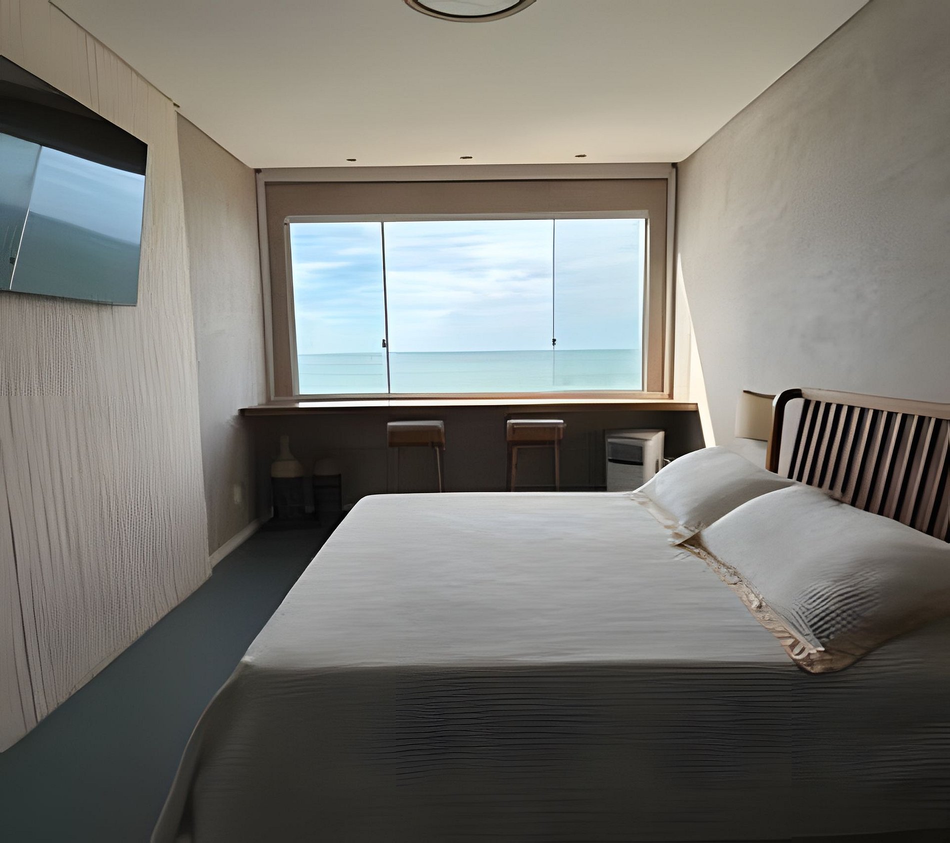 O quarto possui cama aconchegante, TV de 56’’, mesa para home office e uma bancada na janela, ideal para apreciar a vista do mar, tomar um café ou relaxar com um vinho.