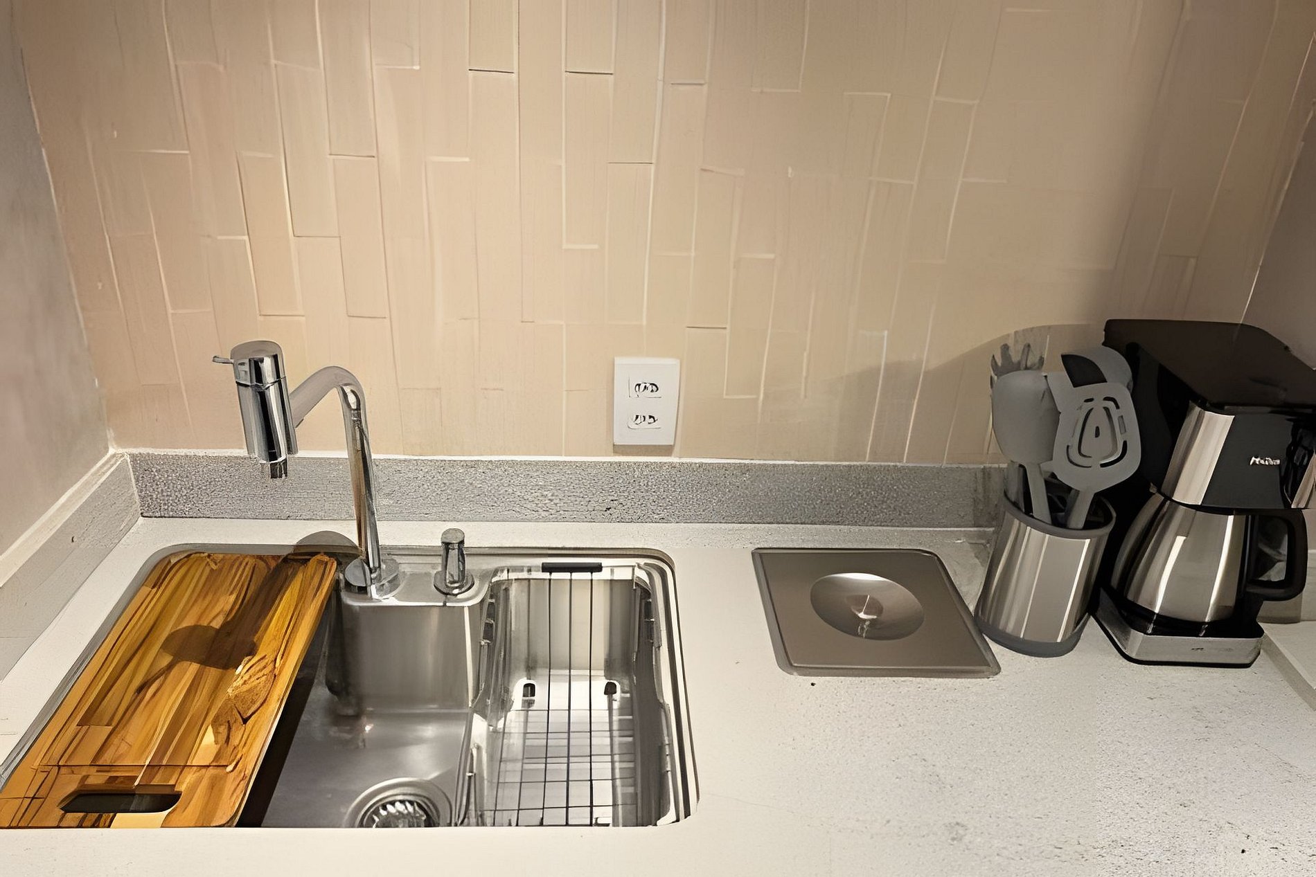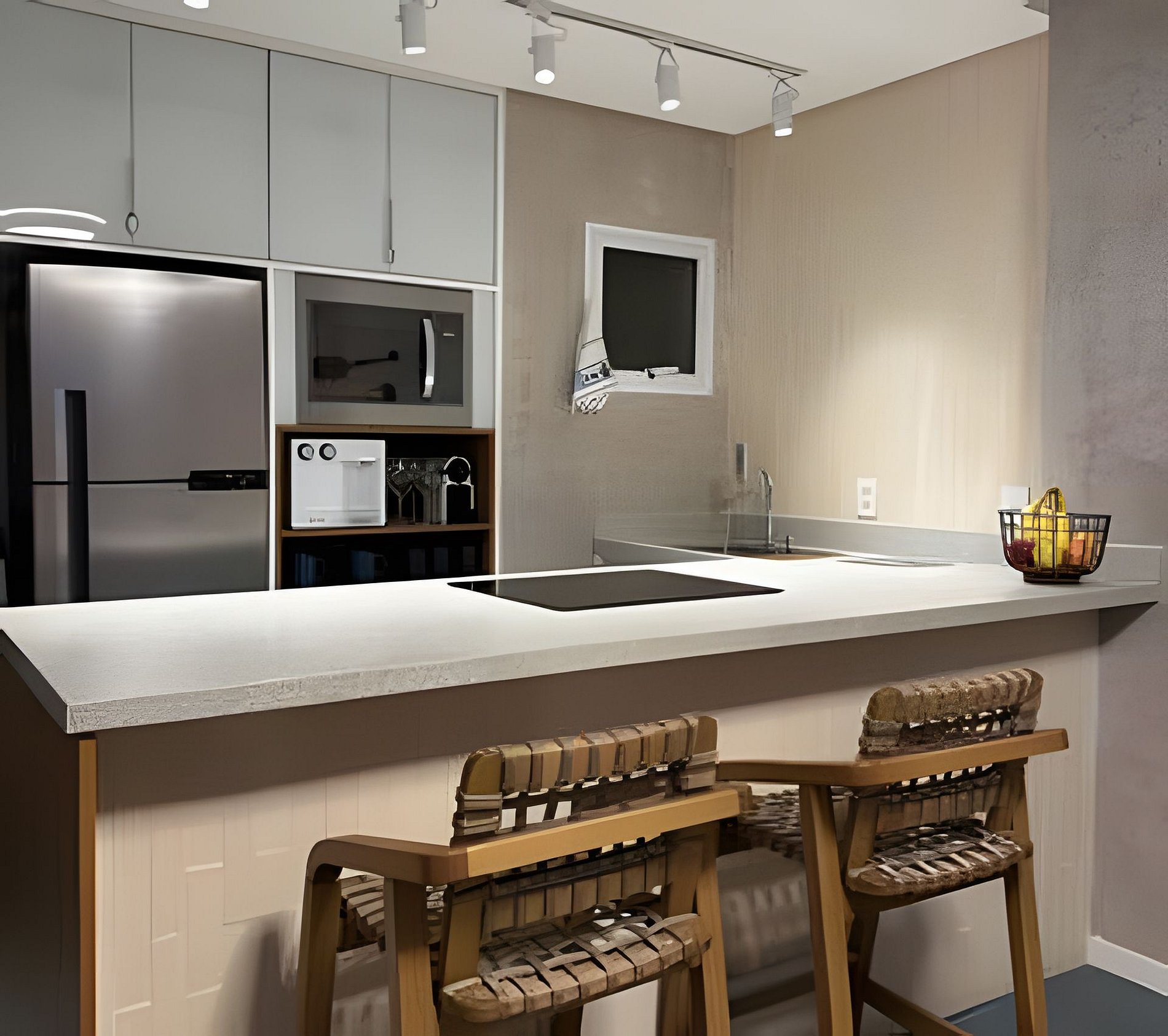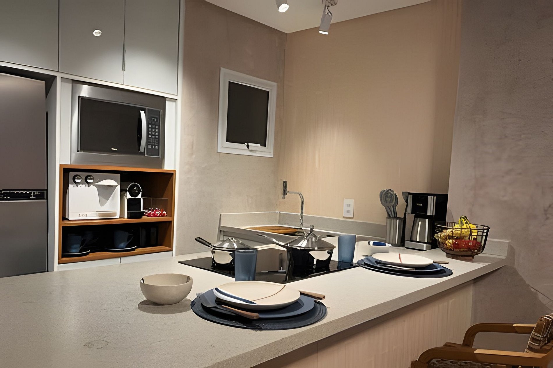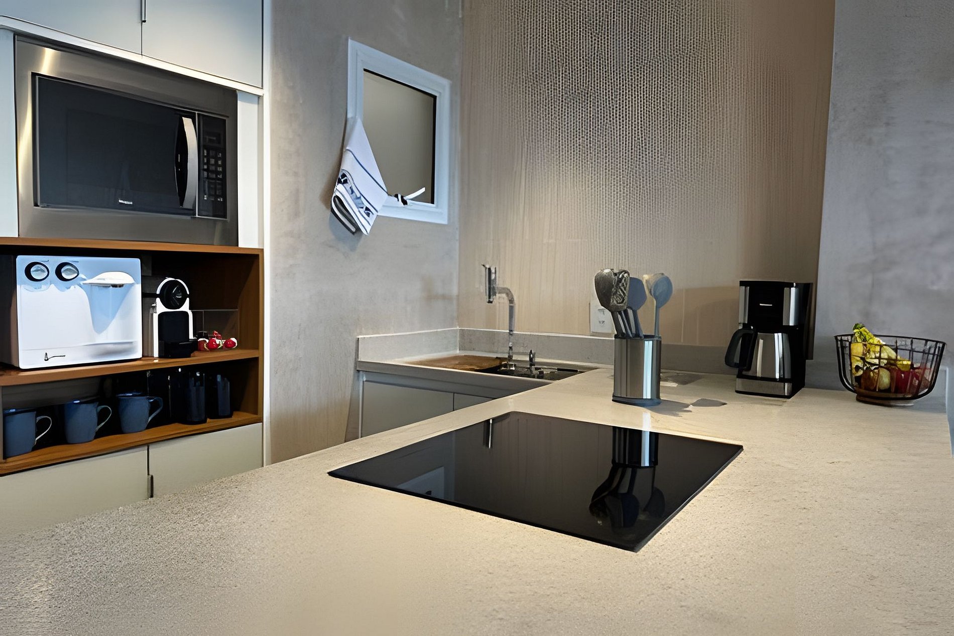 Este apartamento aconchegante conta com uma sala equipada com sofá-cama confortável e TV de 56’’, integrada a uma cozinha completa com cooktop, micro-ondas, forno, geladeira, bebedouro e cafeteira.